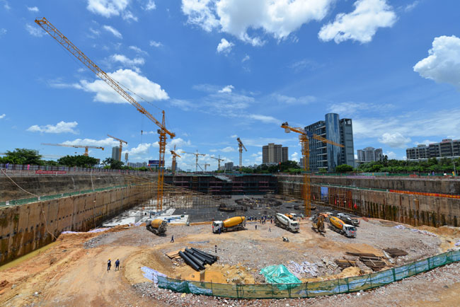 据北京建工集团海口双子塔.南塔项目部执行经理苑会杰介绍“一是该工程总建筑面积38.81万平方米,主塔楼高度为428米,塔楼地上94层,地下4层;二是海口地区属地震设防高烈度区和强台风区,塔体设计抗震8度半,以防地震可能对高楼造成的损害,仅单塔的桩数就多达1993根,是上海中心大厦的2倍有余,且单桩承载力是上海中心大厦主楼抗压桩的2倍,桩深达到88米-102米;三是海口双子塔南塔基坑是全球少见的超深、超大的单体建筑基坑,最深处达25米,基坑占地面积达7000㎡,仅土方量就达到70万方,该面积相当于一个标准足球场大小;该工程塔楼底板基础为桩筏基础,塔楼基础底板混凝土强度等级为C50,抗渗等级为P10,垫层为100mm厚C20混凝土,塔楼底板平面面积约为8600平方米,底板由四周到中间厚度分别为0.7米-8.5米,底板最深8.5米,海口双子塔.南塔已于2016年底完成大楼地下部分桩基工程施工,本次施工主要任务即向地下桩基部分浇灌混凝土,以确保塔基稳定性,此次南塔塔楼筏板基础单次浇筑混凝土9.6万吨,将创海南地区之最,是一个建筑业瞩目的“超级工程”。