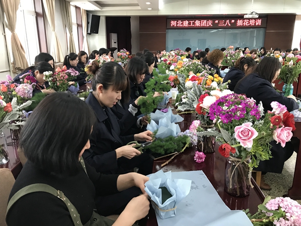 3月8日上午,河北建工集团六楼会议室,70多名女职工置身鲜花丛中,用心学习鲜花养护知识、花语以及插花技巧。