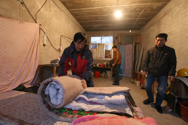 一大早,在距工地不远租住的民房里,王连增和工友胡怪子、王增胜互相帮忙收拾东西。