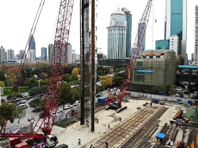 地下分项工程体量大,工期紧,质量要求高。支护、桩基、土方等工程造价已达1亿多元,仅连续墙、桩基、钢筋砼支撑的钢材用量就达5000多吨,混凝土用量约为30000多立方米。基坑支护采用两墙合一地下连续墙,厚度为1000毫米和800毫米,成槽深度可达50余米,在武汉地区极为少见。每幅钢筋笼长达50米(约15层楼高),单幅钢筋笼重量约52吨。其中地下连续墙混凝土强度等级为水下C35P10,具有水下不分离、自密实性、低泌水性和缓凝等特点,这对成槽后混凝土限时浇筑要求非常严格,且地连墙仅上部28米进行了三轴搅拌桩加固,下部易发生塌孔。项目部管理人员自行研制了深处泥浆取样器,更客观、便捷地检测了深处泥浆指标,施工过程中未发生塌孔现象。地下连续墙原设计74幅,经项目部研究后和设计单位沟通,优化为70幅,钢筋笼两次吊装拼接改为一次性整体吊装。不仅有效保障施工安全也提升了施工效率,节约建设成本20余万元,取得双赢的效果。最终,70幅地连墙历时122天全部顺利完工,比原计划提前25天。