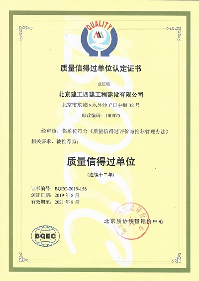 近日,经北京质协质量评价中心审核,北京建工四建工程建设有限公司符合《质量信得过评价与推荐管理办法》相关要求,连续12年被认定为“质量信得过单位”,有效期两年,至2021年8月,这充分体现了四建公司在工程质量管理工作方面的高水平和高标准。