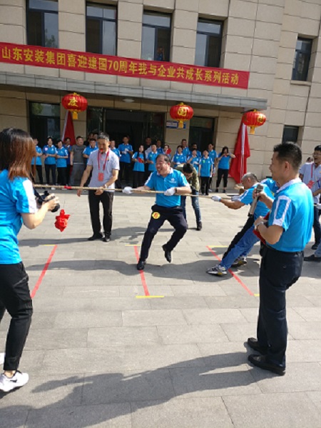 “加油、加油”伴随着一阵阵加油呐喊声,山东省工业设备安装集团有限公司举办的“喜迎建国70周年,我与企业共成长”系列活动暨拔河项目于9月25日上午在总部机关小广场隆重拉开了序幕,来自总部机关近一百名职工采用现场抓阄随机组成8个方队,比赛采用“三局两胜”制,经过紧张激烈的19场回合的较量,其中2、4、6队分别获取了一、二、三等奖,并由全体职工组成了“70”方阵图案和合唱《我和我的祖国》,以实际行动为共和国70华诞献上了一份真诚祝福。