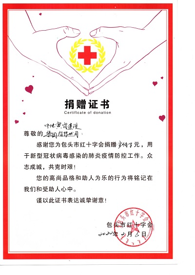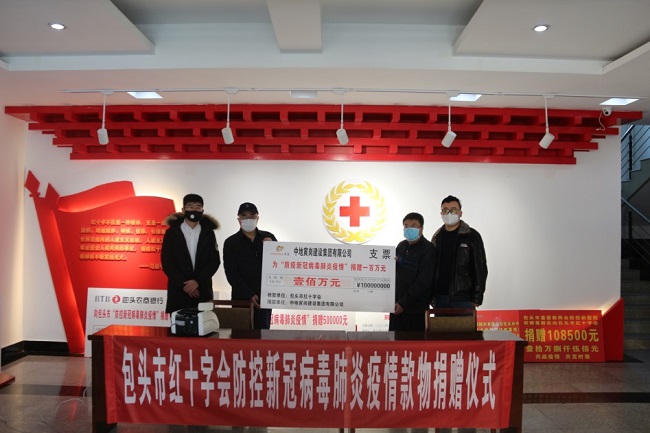 在做好集团员工自身防疫措施的同时,疫情面前集团公司勇于承担社会责任。2月6日上午,中地寅岗建设集团有限公司启动疫情防控爱心捐款行动,集团公司以董事长(总经理)郭志轩、副总经理刘峰、综合部部长王琛熙为代表通过包头市红十字会向包头市第一附属医院及湖北省红十字会捐款人民币共计100万元,用于新冠病毒疫情防控工作。此次捐赠仪式在包头市红十字会救灾备灾中心举行,红十字会副会长王云峰及集团公司代表出席本次捐赠仪式。