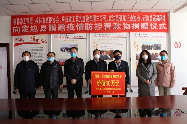 2月14日,在定边县慈善协会承办的捐赠仪式上,九建人的身影再次出现,三公司为定边县教育局和体育局对口捐赠了总价值10万元的2.5吨84消毒液和2000只KN95防护口罩。定边县委书记胡统金在捐赠结束后对九建集团疫情防控期间勇于担当,积极支援地区疫情防控工作的无私奉献行为给予了高度肯定。