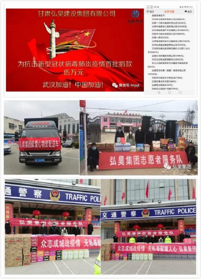 在此期间,全体弘昊人认真履行防疫工作的职责,从小事做起,为本次抗击疫情贡献微薄之力。先后承担了兰州大学第一医院西站院区维修改造项目施工任务,积极参加社会公益活动,为抗击疫情捐款捐物,深入了解员工的出行及健康状况,一起助力武汉,为中国加油。