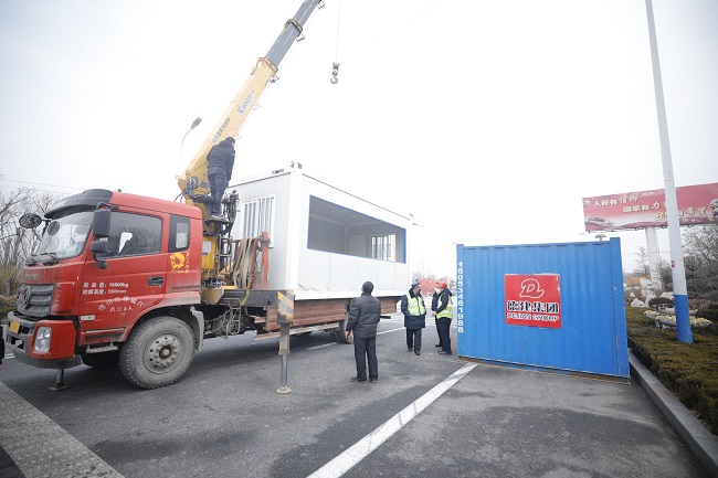 疫情发生以后,德建集团党委敏感地意识到,疫情来势汹汹,又正值冬春之交,天气寒冷,全市防疫用房极有可能处于紧缺状态,德建作为建筑企业,具有建设应急防疫设施的天然优势与当然责任。党委书记靳海洋同志第一时间调度疫情防控与应急支援工作,成立了以集团董事长为组长,总经理为常务副组长的疫情防控与应急支援工作领导小组,要求班子成员和子分公司负责人全部放弃休假,组建了14个疫情防控小组和应急项目部,并迅速启动了常规施工和装配式建筑应急体系,组织人员连夜生产防疫设施。1月26日连续为京台高速德州南出入口、德滨高速德州东出入口安装了4套检查隔离板房。