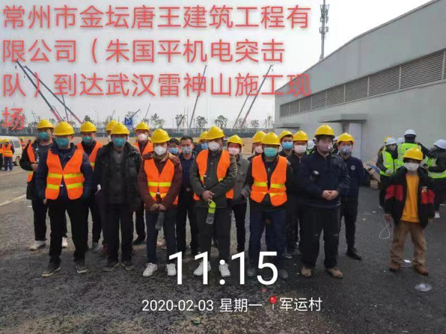 紧急驰援武汉雷神山医院建设工程项目的28名唐王建筑工人,2月3日先后到达雷神山,经过当地体检合格,全部投入雷神山冲刺决战,与病毒抢时间,为金坛,为唐王争光。在他们的马甲上,都写上“唐王”两个字。他们每天加班加点突击抢工,经常连续工作20小时,不喊苦,不喊累,心里想的就是尽快完成工作,尽快交付使用。在他们的努力下,最终提前两天顺利完成上级交予的任务。还未顾得上休息,他们又投入到协助其他兄弟队伍完成任务的工作中去。