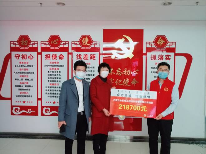 新型冠状病毒肺炎疫情发展态势严峻,时刻牵动着亿万同胞的心,在疫情防控的关键时刻,内蒙古金长城工程项目管理有限公司以强烈的家国情怀和高度的社会责任感,在董事长王丽梅的带领下,第一时间行动起来,踊跃为抗击疫情贡献力量,2020年2月10日内蒙古金长城工程项目管理有限公司通过鄂尔多斯市红十字会捐款人民币218700元,其中10万元用于鄂尔多斯市新型冠状病毒肺炎疫情防控工作,6.87万元用于武汉市新型冠状病毒肺炎疫情防控工作,3万元用于兴安盟新型冠状病毒肺炎疫情防控工作,2万元用于阿尔山市新型冠状病毒肺炎疫情防控工作。