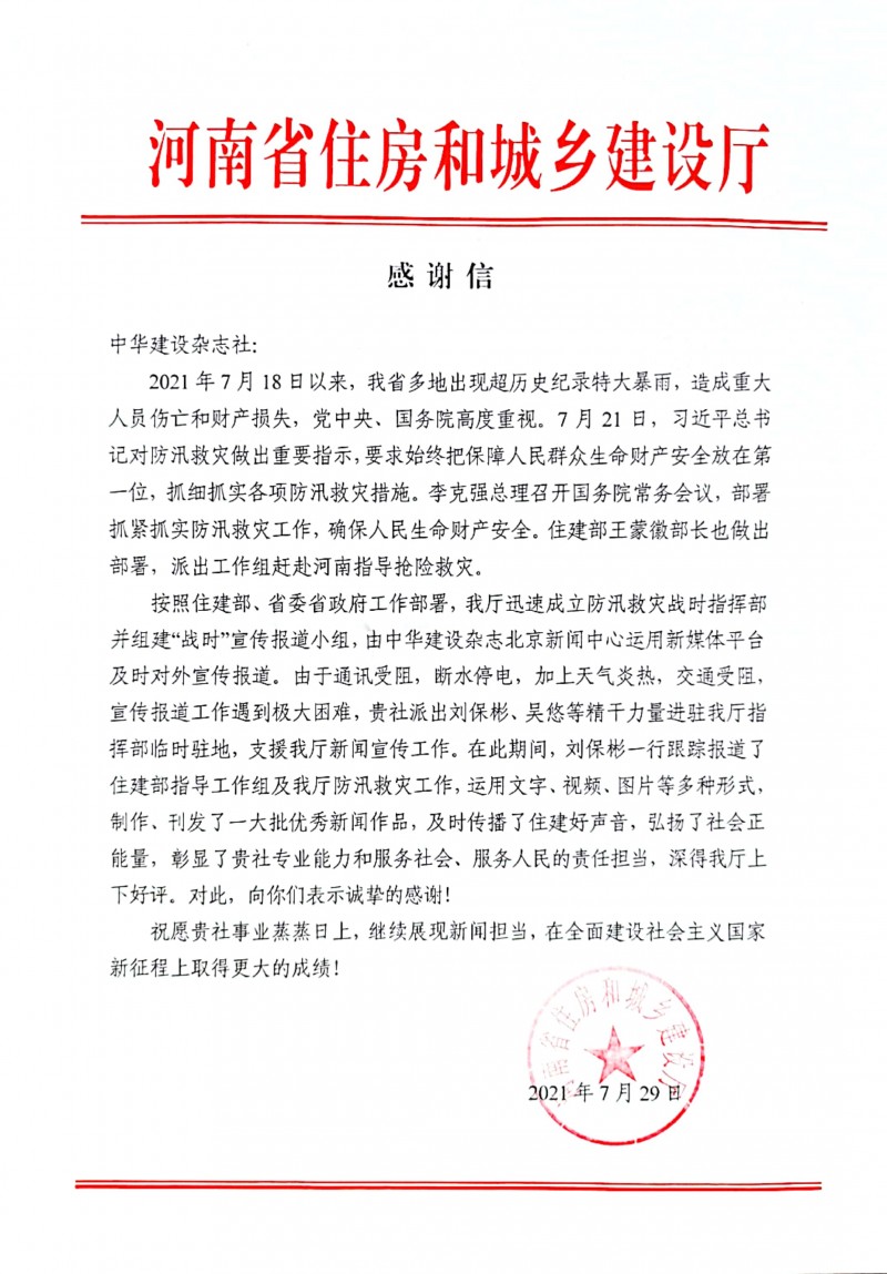 为此,7月30日,河南省住房和城乡建设厅给《中华建设》杂志社发来《感谢信》,对《中华建设》在河南7.20防汛救灾中展现的责任担当予以高度好评,对所做的宣传报道工作表示诚挚感谢。